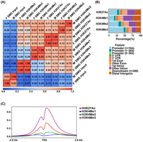 Epigenomic marks in the human SMG. (A) Clustered heatmap of the Pearson correlation for the H3K27Ac, H3K4Me1, H3K4Me2, and H3K4Me3 ChIP-seq data based on the normalized read coverage across genome-wide regions. F = Female. M = Male. (B) Bar plots showing the percentage distribution patterns and locations of peaks of H3K27Ac, H3K4Me1, H3K4Me2, and H3K4Me3 relative to genes. (C) Metaplots of average ChIP-seq density of the 4 histone marks at the TSSs of genes. Enriched H3K4Me3 marks the TSSs of active genes.