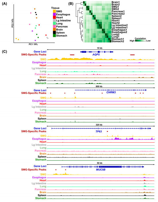 Just as specific genes show enriched expression in the SMG, we hypothesized that SMG-specific cis-regulatory elements also play a key role in regulating gene expression patterns essential for salivary gland biology. To identify such regulatory regions, we next compared the H3K27Ac-marked peaks in the human SMG to H3K27Ac-marked peaks from multiple human tissues available through the ENCODE project [33]. Utilizing DiffBind, we were able to confirm that the ~50,000 H3K27Ac peaks identified in the SMG represent a unique set of regulatory regions, as shown by PCA (Figure 4A). Hierarchical analysis showed that the SMG samples clustered tightly together and were positioned proximal to the pancreatic tissue, another excretory gland with similar secretory functions (Figure 4B). We next utilized Genomic Regions Enrichment of Annotations Tool (GREAT) [24] to identify genes that are associated with these SMG-specific regulatory regions [34]. This analysis identified 4243 genes associated with SMG-enriched H3K27Ac-marked genomic regions (Table S3). Not surprisingly, several genes that are relevant and feature prominently in SG biology were present in the list, including AQP5, CHRM3, TP63, and MUC5B (Figure 4C).