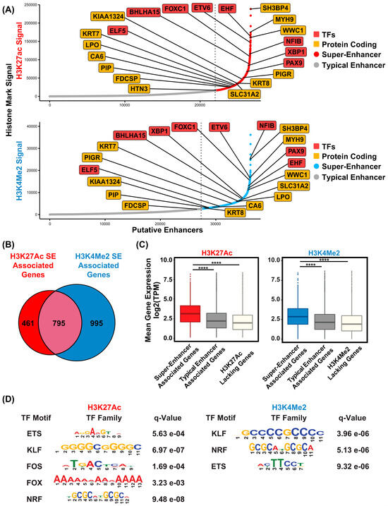 Recent studies have suggested that additional histone modifications, such as H3K4Me2, a mark associated with active transcription, can offer an alternative strategy for identifying SEs [40]. Hence, we applied the ROSE algorithm to the human SMG H3K4Me2 ChIP-seq dataset, which led to the identification of 1644 SE-associated genes (Figure 5A lower panel, Table S6). The H3K4Me2-marked SEs showed similar associations with TFs and other regulatory elements likely to play prominent roles in SMG biology. Importantly, there was robust overlap between SEs identified using H3K4Me2 and those generated from H3K27Ac-based analysis (Figure 5B). Given the prevailing notion that enhancers represent a heterogeneous group with varying levels of strength and functionality [41,42], it is not surprising that SE-associated genes marked by H3K27Achi and H3K4Me2hi did not completely overlap. Nevertheless, we found a significant number of SE-associated genes to be shared among both datasets (Figure 5B)—this gene list was considered as a high-confidence dataset and was used for further analyses.