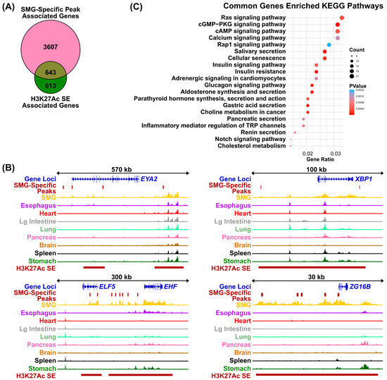 Genomic loci of genes marked by tissue-specific enhancers in the SMG. (A) Venn diagram showing SMG-specific, enriched H3K27Ac-marked genomic sites. (B) Visualization of normalized H3K27Ac signal across the tissue cohort at the EYA2, XBP1, ELF5, EHF, and ZG16B genomic loci. The SMG-specific EYA2, XBP1, ELF5, EHF, and ZG16B super-enhancers, as determined by DiffBind analysis, are highlighted by the solid brown lines. (C) KEGG pathways analysis of SMG-specific, enriched H3K27Ac- and super-enhancer-marked genes identified in panel A above.