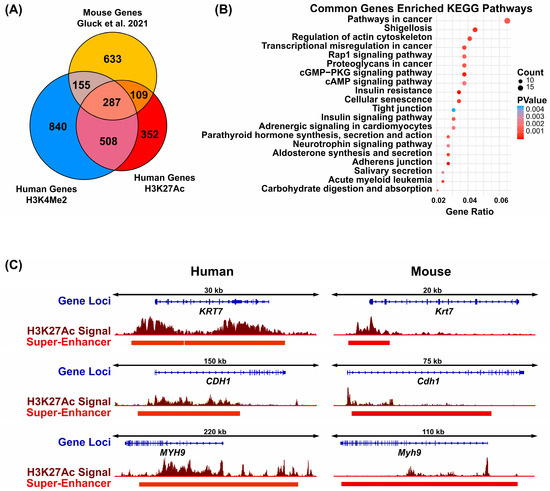 We subsequently aimed to evaluate super-enhancers and their associated genes that are conserved between mice and humans. We reasoned that such conserved regions, due to their low rate of evolution—an inherent trait of some functional sequences compared to nonfunctional ones—might reveal cis-regulatory regions important for SG biology [43]. Prior studies suggest that while some enhancers are conserved across species, others may have undergone lineage-specific reprogramming as a consequence of human–mouse speciation or divergence. In order to identify super-enhancers that are conserved between mouse and human, we overlaid super-enhancer-proximal genes, that we identified in the human SMG using both the H3K27Ac and H3K4Me2 datasets, with the super-enhancer-proximal genes, that we have previously identified in the mouse SMG based on high H3K27Ac signal [12]. This analysis identified 287 genes that were commonly associated with SEs in all three datasets (Figure 7A and Table S7). Subsequent Gene Set Enrichment Analysis (GSEA) showed that these 287 conserved SE-associated genes are important in salivary gland function, with the pathways represented by this list of genes including the aforementioned Rap1, cGMP-PKG, and cAMP signaling pathways as well as salivary secretion (Figure 7B). To better appreciate the conservation of regulatory elements, we showcase H3K27Ac-marked SE in both human (Figure 7C, left panel) and mouse (Figure 7C, right panel) as evident from ChIP-seq signal pileup plots for three well-known salivary gland epithelial markers: KRT7, CDH1, and MYH9. Taken together, these results reveal the high degree of conservation in super-enhancers between mice and humans, suggesting that genes regulated by these conserved enhancers may represent key regulatory nodes of relevance for future studies in SG biology.