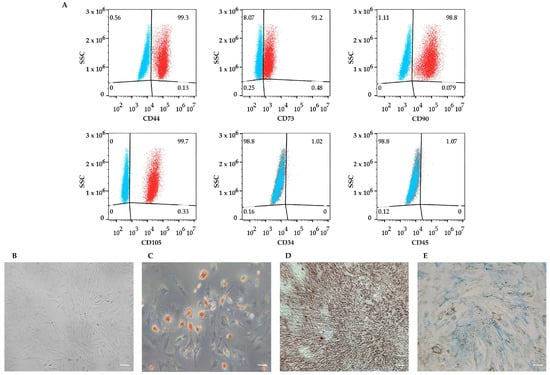 Characterization of human dermal mesenchymal stem cells (hDMSCs). (A) Flow cytometry-based immunophenotypic analysis. Cells expressed CD44, CD73, CD90, and CD105 mesenchymal surface markers and were negative for hematopoietic CD34 and CD45 ones. Blue and red clouds represent unstained cells (control) and cells stained with specific antibody, respectively. (B–E) Morphology and trilineage differentiation potential of hDMSCs: (B) hDMSCs undifferentiated; (C) adipocytes containing intracellular lipid vacuoles stained red by Oil Red O (O.R.O) solution; (D) osteocytes containing calcium deposits stained red by Alizarin Red S solution; (E) chondrocytes containing cartilage proteoglycans stained in blue with Alcian Blue solution. Scale bars: 50 μm.