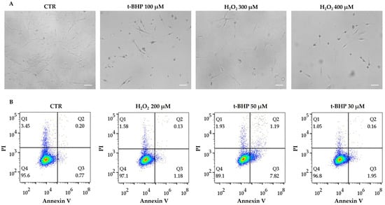 To evaluate the possible cytotoxic effects of t-BHP and H2O2, hDMSCs were preliminary treated with a wide range of concentrations and analyzed 48 h after the end of treatment using optical microscopy. The highest concentration of t-BHP (100 μM) as well as H2O2 at 300 and 400 μM concentrations were found to be cytotoxic; compared with the control cells (CTR), treated cells completely lost their shape and showed a tendency to detach from the plastic support (Figure 2A). Therefore, all these concentrations were excluded in subsequent experiments.