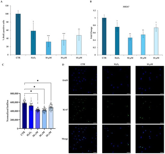 Moreover, to confirm the proliferation data, the expression of the MKI67 gene was investigated. Both treatments significantly reduced the expression of MKI67 mRNA, with a trend similar to that observed in the BrdU assay (Figure 3B). According to these results, the data obtained with the immunofluorescence assay showed a significant decrease in the number of Ki-67-positive cells (green signal) after treatment with t-BHP, already evident at the lowest tested concentration of 10 μM compared with CTR (Figure 3C,D and Figure S1). In addition, the weaker effect of H2O2 on the reduction in proliferation of hDMSCs compared with t-BHP was here confirmed (Figure 3C,D and Figure S1).