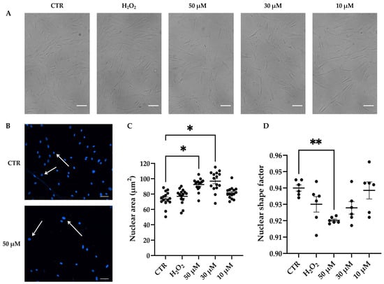 Morphology in human dermal mesenchymal stem cells (hDMSCs) 48 h after the end of tert-butyl hydroperoxide (t-BHP) treatment. hDMSCs were treated for 2 h with t-BHP (10, 30, and 50 μM) or hydrogen peroxide (H2O2) 200 μM. Untreated cells were used as control (CTR). (A) Morphological analysis of hDMSCs. Scale bars: 50 μm. (B,C) Analysis of nuclear size in hDMSCs. hDMSC nuclei were counterstained with NucBlue® Fixed Cell ReadyProbes® Reagent (DAPI) (blue signal). (B) Representative images of CTR cells and cells treated with 50 μM t-BHP acquired using a Nikon inverted microscope Eclipse Ti2-E and a digital sight camera DS-Qi2, through the imaging software NIS-Elements. White arrows highlight nuclei of different sizes. Scale bars: 25 μm. (C) The scatter plot represents the mean of the nuclei areas ± standard error of the mean (SEM) analyzed by using ImageJ 1.53 software. Each dot corresponds to an image containing at least 300 cells; n = 3. One-way ANOVA: * p < 0.05 vs. CTR. (D) The scatter plot represents the mean of nuclear shape factor ± SEM. Data were obtained by analyzing nuclei image with NIS-Elements Advance Research software; n = 3. One-way ANOVA: ** p < 0.01.