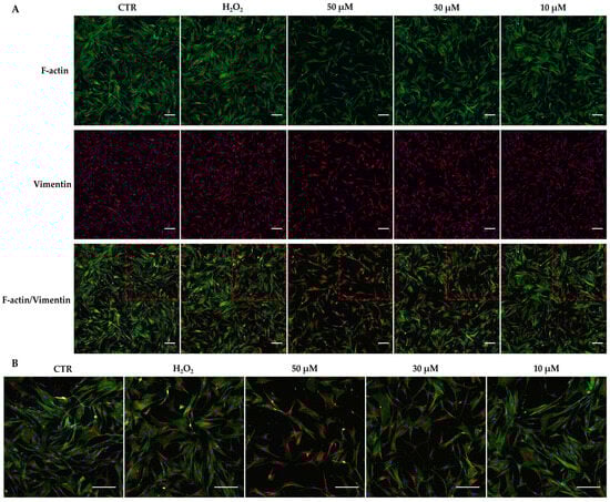 Immunofluorescence evaluation of cytoskeleton markers in human dermal mesenchymal stem cells (hDMSCs) 48 h after the end of tert-butyl hydroperoxide (t-BHP) treatment. (A) hDMSCs were treated for 2 h with t-BHP (10, 30, and 50 μM) or hydrogen peroxide (H2O2) 200 μM. Untreated cells were used as control (CTR). hDMSCs were stained with Phalloidin (green signal, specific for F-actin) and anti-vimentin antibody (red signal). DAPI was used to counterstain nuclei (blue signal). The ratio between actin filaments and vimentin is highlighted by the orange signal; an increase in the intensity of this color indicates a decrease in the ratio. The dotted red square indicates the area of the image that is magnified in (Panel B). Scale bars: 50 μm. (B) Magnification (dotted red square) of the images in (Panel A).