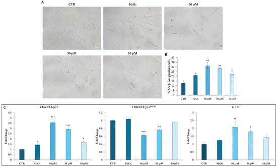 Evaluation of cellular senescence in human dermal mesenchymal stem cells (hDMSCs) 48 h after the end of tert-butyl hydroperoxide (t-BHP) treatment. hDMSCs were treated for 2 h with t-BHP (10, 30, and 50 μM) or hydrogen peroxide (H2O2) 200 μM, or untreated (CTR). (A,B) Senescence-associated β-galactosidase (SA-β-Gal) staining assay in hDMSCs. (A) Representative images of SA-β-Gal assay: positive cells are blue and negative cells are unstained. Scale bars: 50 μm. (B) Histograms represent the percentage of SA-β-Gal positive cells manually counted ± standard deviation (SD). n = 3; one-way ANOVA: * p < 0.05 and ** p < 0.01 vs. CTR. (C) Gene expression analysis of senescent markers cyclin-dependent kinase inhibitor 1A (CDKN1A or p21), cyclin-dependent kinase inhibitor 2A (CDKN2A or p16INK4a), and interleukin 1 beta (IL1B) in hDMSCs. Data were normalized using two housekeeping genes (glyceraldehyde 3-phosphate dehydrogenase—GAPDH and hypoxanthine phosphoribosyl transferase 1—HPRT1); the normalized expression value of CTR was set up to 1, and all other gene expression values were reported to that sample. Data are reported as normalized fold change ± standard error of the mean (SEM); n = 3. One-way ANOVA: * p < 0.05, ** p < 0.01, and *** p < 0.001 vs. CTR.