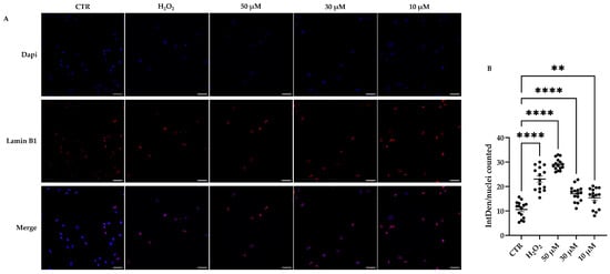 Immunofluorescence analysis of Lamin B1 in human dermal mesenchymal stem cells (hDMSCs) 48 h after the end of tert-butyl hydroperoxide (t-BHP) or hydrogen peroxide (H2O2) treatments. hDMSCs were treated for 2 h with t-BHP (10, 30, and 50 μM) or H2O2 200 μM. Untreated cells were used as control (CTR). (A) Representative images of hDMSCs stained with anti-Lamin B1 antibody (red signal) and DAPI, used to counterstain nuclei (blue signal). Scale bars: 50 μm. (B) Quantification of Lamin B1 fluorescence by using NIS-Elements Advance Research software. The scatter plot represents the mean of fluorescence intensity (IntDen) normalized on the number of cells ± standard error of the mean (SEM). Each dot represents the number of fields analyzed in each condition. In each field, at least 300 nuclei were counted; n = 3. One-way ANOVA: ** p < 0.01 and **** p < 0.0001.