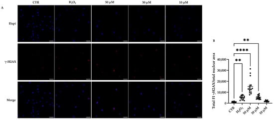 Immunofluorescence analysis of phosphorylated H2AX (γH2AX) in human dermal mesenchymal stem cells (hDMSCs) 48 h after the end of tert-butyl hydroperoxide (t-BHP) or hydrogen peroxide (H2O2) treatments. hDMSCs were treated for 2 h with t-BHP (10, 30, and 50 μM) or H2O2 200 μM. Untreated cells were used as control (CTR). (A) Representative images of hDMSCs stained with anti-γH2AX antibody (red signal) and DAPI, used to counterstain nuclei (blue signal). Scale bars: 50 μm. (B) Quantification of γH2AX fluorescence by using NIS-Elements Advance Research software. The scatter plot represents the mean of total fluorescence intensity (FI) normalized on the total nuclear area ± standard error of the mean (SEM). Each dot represents the number of fields analyzed in each condition. In each field, at least 300 nuclei were counted; n = 3. One-way ANOVA: ** p < 0.01 and **** p < 0.0001.