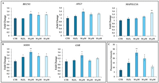 Evaluation of autophagy and oxidative stress pathways in human dermal mesenchymal stem cells (hDMSCs) 48 h after the end of tert-butyl hydroperoxide (t-BHP) treatment. hDMSCs were treated for 2 h with t-BHP (10, 30, and 50 μM) or hydrogen peroxide (H2O2) 200 μM, or untreated (CTR). (A,B) Gene expression analysis of autophagy-related markers and antioxidant genes in hDMSCs. The expression of genes involved in the (A) autophagy pathway beclin 1 (BECN1), autophagy related 7 (ATG7), and microtubule-associated protein 1 light chain 3 alpha (MAP1LC3A) or in the (B) oxidative stress pathway superoxide dismutase 1 (SOD1) and glutathione-disulfide reductase (GSR) was evaluated. Data were normalized using two housekeeping genes (glyceraldehyde 3-phosphate dehydrogenase—GAPDH and hypoxanthine phosphoribosyl transferase 1—HPRT1); the normalized expression value of CTR was set up to 1, and all other gene expression values were reported to that sample. Data are reported as normalized fold change ± standard error of the mean (SEM); n = 3. One-way ANOVA: * p < 0.05 and ** p < 0.01 vs. CTR. (C) Reactive oxygen species (ROS) production in hDMSCs. The extent of ROS generation was evaluated in hDMSCs treated for 2 h with t-BHP (10, 30, and 50 μM) or H2O2 200 μM, or without treatment (CTR) immediately after the end of the treatments. Histograms represent the mean fluorescence intensity at 535 nm ± standard deviation (SD). n = 3; One-way ANOVA: * p < 0.05 and ** p < 0.01 vs. CTR.