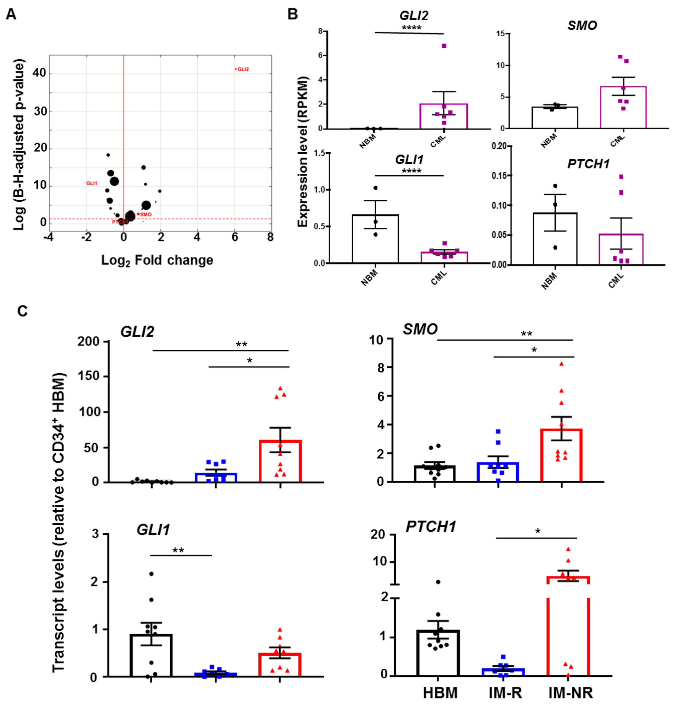 3.1. HH-Associated Genes, SMO and GLI2, Are Highly Elevated in CD34+ CML Cells, Particularly in IM-Nonresponders