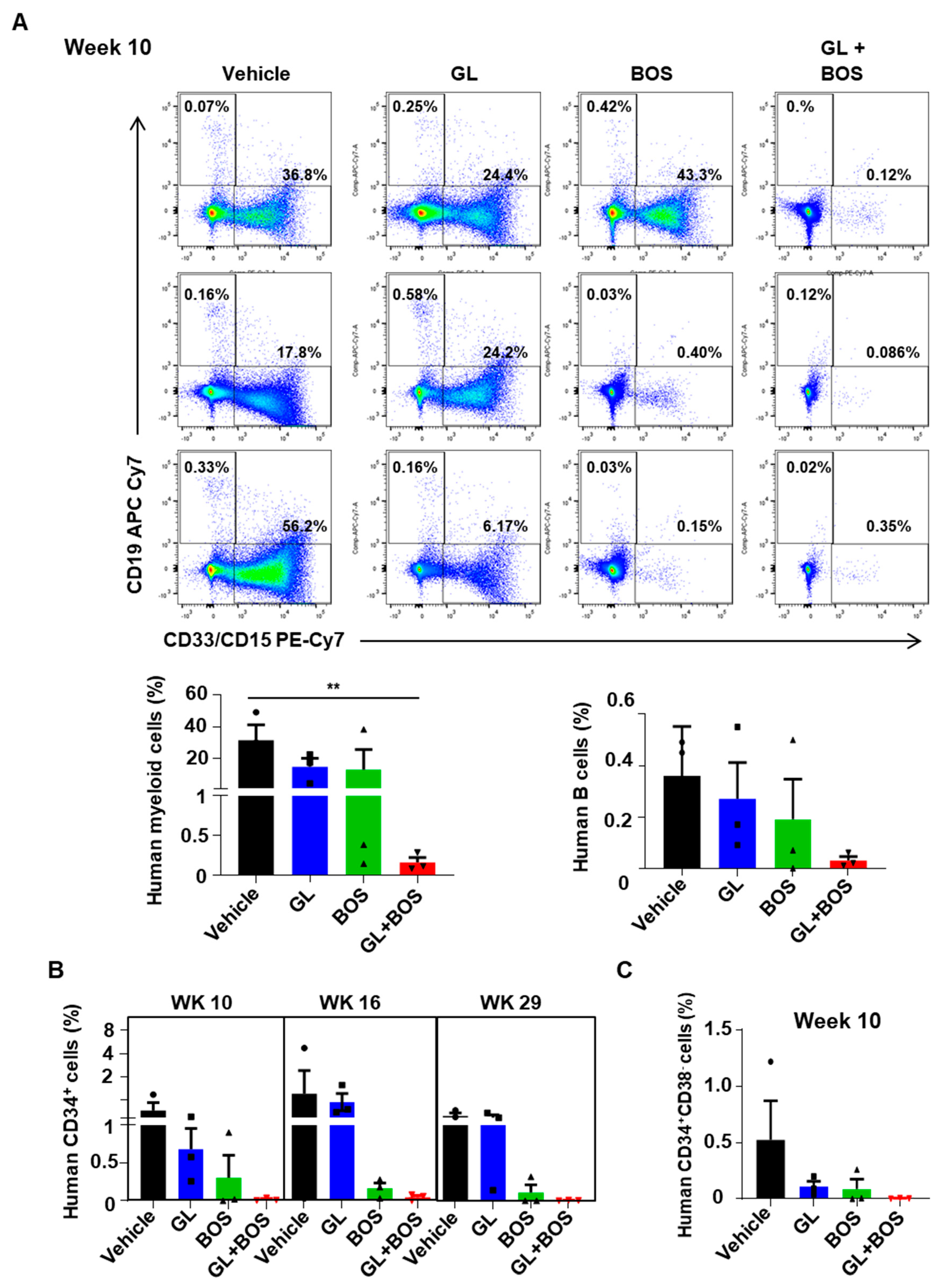 3.6. Dual Inhibition of SMO and BCR-ABL1 in CD34+ Stem/Progenitor Cells Resulted in Reduced Engraftment of Leukemic Cells in a Patient-Derived Xenotransplantation (PDX) Model