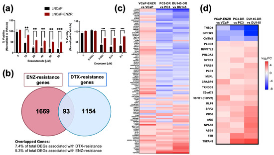 The development of resistance to ENZ in PCa cells can be associated with cross-resistance to subsequent treatments with ARSI or taxane drugs [69]. To gain insights into mechanisms underlying this drug cross-resistance we first evaluated the cytotoxic effects of ENZ and DTX on LNCaP and LNCaP-ENZR PCa cells. Our results revealed that LNCaP-ENZR cells displayed higher viability than their drug-sensitive counterparts when exposed to increasing concentrations of ENZ up to 80 μM (Figure 1a). These cells also exhibited resistance up to 0.1 μM DTX (Figure 1a), a concentration that is 10 times higher than the concentration of DTX (10 nM) used to maintain DTX-resistant PCa cells in culture.