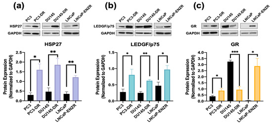 Immunoblotting revealed that HSP27 expression was significantly upregulated in PC3-DR, DU145-DR and LNCaP-ENZR cells compared to their parental, drug-sensitive counterparts (Figure 2a). In addition, using the same panel of drug-sensitive and -resistant PCa cell lines we confirmed the expression of LEDGF/p75, a known regulator of HSP27 in PCa cells [36,41]. Similarly to HSP27, LEDGF/p75 and GR expressions were enhanced in drug-resistant cells (Figure 2b,c). Prolonged ARSI treatment in PCa cells leads to upregulated GR expression, a feature associated with ARSI-resistance [15,16], and this was observed in our LNCaP-ENZR cells (Figure 2c). Previously, we demonstrated that GR regulates and interacts with LEDGF/p75 to form a transcriptional complex that promotes taxane resistance in PCa [31]. Additionally, while GR protein expression levels are downregulated in DU145-DR cells (Figure 2c), we reported a rapid increase in translocated nuclear GR (activated GR) in these cells in the presence of glucocorticoids [28]. HSP27 and GR expression levels were also upregulated in the AR+/GR+ 22Rv1-DR PCa cell line compared to their sensitive counterpart. However, there was no difference in LEDGF/p75 expression, most likely due to the combined effects of AR and GR signaling, both of which induce LEDGF/p75 expression [29,31] (Supplementary Figure S4).