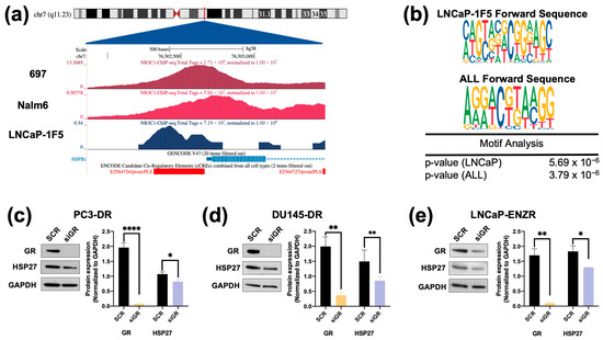ChIP-seq analysis identifies GR occupancy at the HSP27 promoter, and silencing GR leads to cell line-specific decrease in HSP27 protein expression levels in DTX- and ENZ-resistant PCa cells. Chromatin immunoprecipitation sequencing (ChIP-seq) for the glucocorticoid receptor (GR/NR3C1) was performed in prostate cancer and acute myeloid leukemia cell lines using datasets GSE30623 and GSE175482. (a) Visualization using the UCSC Human Genome Browser (GRCh38) shows normalized NR3C1 binding peaks near the transcription start site (TSS) of HSPB1, the gene encoding HSP27. ChIP-seq tracks are depicted in shades of blue, the GENCODE v43 HSPB1 transcript is shown in blue, and ENCODE promoter-like elements are highlighted in red. (b) Motif analysis using the MEME Suite tool identified potential NR3C1 binding sites in LNCaP-1F5, 697, and Nalm6 cell lines. DTX-resistant PCa cell lines PC3-DR (c), DU145-DR (d), and ENZ-resistant LNCaP-ENZR (e) were transfected with siRNA specific for GR or scrambled negative control oligos (SCR) for 72 h, leading to significant HSP27 downregulation. Quantified band values for GR and HSP27 were obtained with ImageJ software and plotted as relative protein expression normalized to GAPDH. Statistical analyses were performed using unpaired t tests comparing SCR to siLEDGF or siGR samples. * p < 0.05, ** p < 0.01, **** p < 0.0001. Error bars represent mean ± SEM from at least 3 independent experiments for each cell line.