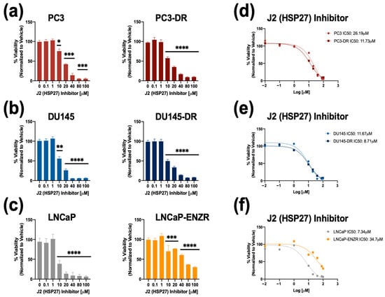 To determine the significance of HSP27 blockade in ENZ-DTX cross-resistance, we targeted HSP27 using a commercially available inhibitor (J2) that induces abnormal dimer formation and attenuates the formation of HSP27 polymers to stimulate its degradation [72]. Recent studies showed that combining J2 with chemotherapeutic agents such as taxol, cisplatin, or 17-AAG, increased the response of chemoresistant lung adenocarcinoma to these agents [72]. To assess the cytotoxic effects of J2 in our PCa cell line panel, we treated both drug-sensitive and -resistant PCa cell lines with increasing concentrations of J2 inhibitor (0.1–100 µM) for 72 h. All PCa cell lines exhibited a significant decrease in cell viability at concentrations of 10 µM or above (Figure 4a–c). The calculated IC50 values of J2 were: 26.19 µM (PC3), 11.73 µM (PC3-DR), 11.67 µM (DU145), 8.71 µM (DU145-DR), 7.34 µM (LNCaP), and 34.7 µM (LNCaP-ENZR) (Figure 4d–f).