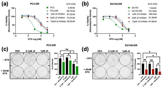 Next, we used MTT assays to assess the combinatorial effects of J2 plus DTX on the resistant cells by treating PC3-DR and DU145-DR with 1 μM, 5 μM and 10 μM of J2 in combination with increasing concentrations of DTX (0.1 nM, 1 nM, 10 nM, 100 nM, and 1000 nM). The J2 concentrations were selected based on the results from Figure 4 indicating IC50 values around 10 μM in these DR cell lines. IC50 values for DTX were also calculated for PC3 (4.46 nM), PC3-DR (96.75 nM), DU145 (7.62 nM) and DU145-DR (151.9 nM) to determine changes in cellular responses to DTX in combination with J2. The combinatorial treatment of J2 (1 μM, 5 μM and 10 μM) plus DTX (0.1 nM, 1 nM, 10 nM, 100 nM, and 1000 nM) increased DTX cytotoxicity in PC3-DR cells as the DTX IC50 values decreased to 87.02 nM, 74.07 nM and 39.05 nM, respectively (Figure 6a). Similarly, the DU145-DR cells exhibited reduced IC50 values when J2 was combined with DTX (Figure 6b).