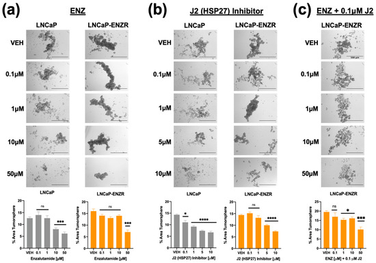 Previously, we showed that tumorsphere formation in DTX-resistant PCa cells can be attenuated by targeting LEDGF/p75 [30]. To assess the impact of targeting HSP27 on tumorsphere formation in drug-resistant PCa cells, we treated LNCaP and LNCaP-ENZR cells with varying concentrations of ENZ alone (0.1 μM, 1 μM, 10 μM, 50 μM), J2 alone (0.1 μM, 1 μM, 5 μM, 10 μM), or a combination of J2 (0.1 μM) with increasing ENZ doses. ENZ monotherapy significantly reduced tumorsphere formation at 10 μM in LNCaP cells, while the LNCaP-ENZR cells only responded partially at 50 μM (Figure 7a). Similarly, J2 alone decreased tumorsphere formation in LNCaP cells at 0.1 μM, but LNCaP-ENZR cells required 5 μM for a comparable effect (Figure 7b). This suggested that LNCAP-ENZR tumorspheres were more resistant to both ENZ and the J2 inhibitor. We then examined whether co-treatment with J2 (0.1 μM—a non-cytotoxic dose alone as shown in Figure 4c) and increased ENZ concentrations could sensitize LNCaP-ENZR cells to ENZ. This combination significantly enhanced cellular response to ENZ with reduced tumorsphere formation observed as low as 1 μM ENZ + 0.1 μM J2 (Figure 7c). We also assessed the effect of DTX alone and in combination with J2 in LNCaP and LNCaP-ENZR cells. Both cell lines showed reduced spheroid formation starting at 1 nM DTX (Supplementary Figure S4a). The combination of DTX with J2 had a similar effect (Supplementary Figure S4b).