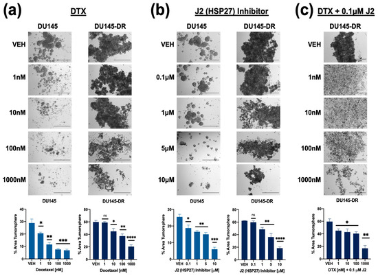 Combining HSP27 inhibition with DTX treatment reduces tumorsphere formation in both DTX-sensitive and -resistant PCa cells. DU145 and DU145-DR cells were cultured in MammoCult media supplemented with varying concentrations of DTX (1 nM, 10 nM, 100 nM, 1 μM) (a), J2 (0.1 μM, 1 μM, 5 μM, 10 μM) (b), or a combination of J2 (0.1 μM) plus DTX (1 nM, 10 nM, 100 nM, 1 μM) (c) for five days. DMSO was used as a vehicle control. Images were captured using an Olympus IX70 microscope at 4× magnification, with a scale bar of 500 μm applied to all representative images. Total tumorsphere area was quantified from four images per condition for each cell line using Image J. Data represent the mean ± SEM from at least 3 independent experiments. Statistical significance was determined as follows: * p < 0.05, ** p < 0.01, *** p < 0.001, **** p < 0.0001. ns = not significant.