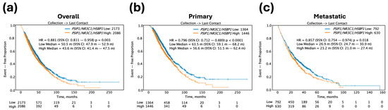 Kaplan–Meier survival curves for PCa patient cohorts stratified by high versus low transcript expression of the target three-gene panel including PSIP1 (LEDGFp75), NR3C1 (GR), and HSPB1 (HSP27). (a) OS for all PCa patient tumor samples (n = 4259), including primary and metastatic tumors, comparing patients with low (blue curve) versus high (orange curve) transcript expression of the three-gene panel. (b) OS for primary PCa patient tumor samples (n = 2810) comparing low versus high gene panel expression. (c) OS for metastatic PCa patient tumor samples (n = 1422) comparing low versus high gene panel expression.