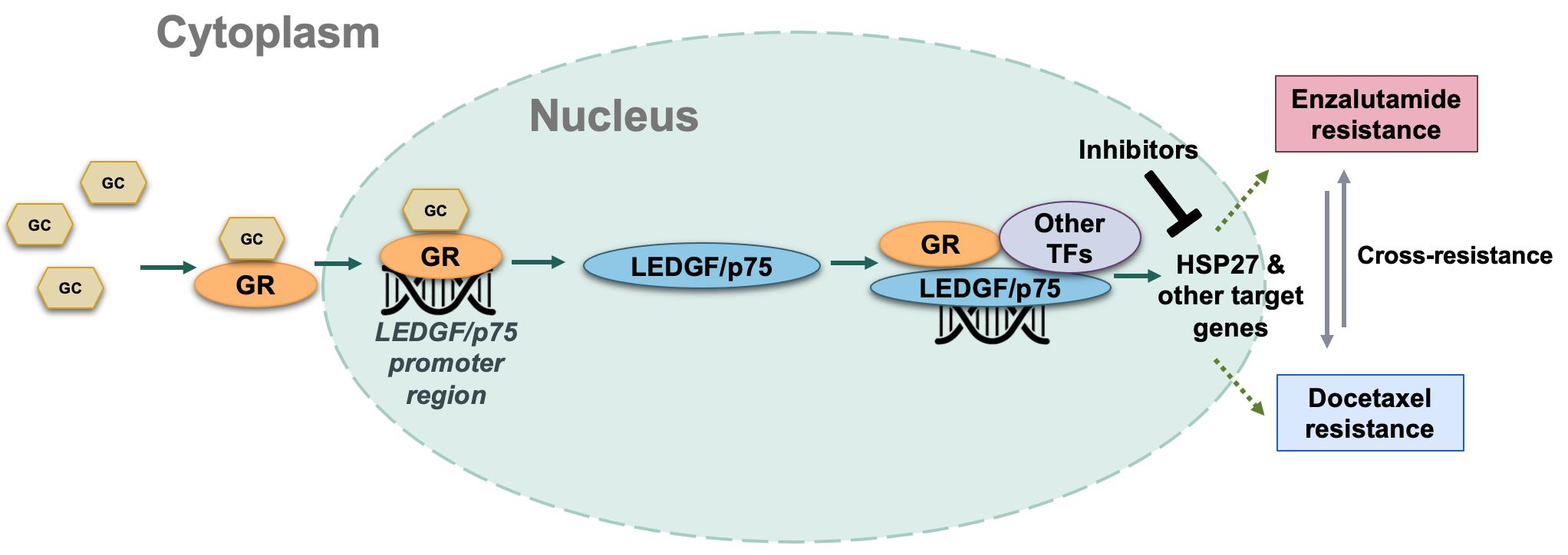 Ochoa, P.T.; Sanchez-Hernandez, E.S.; Duran, A.M.; Cheng, K.W.; Philip, J.; Suzuki, T.; Unternaehrer, J.J.; Dutil, J.; Das, B.; Ganguly, R.; et al. The GR-LEDGF/p75-HSP27 Axis Contributes to Cross-Resistance Between Enzalutamide and Docetaxel in Prostate Cancer. Cells 2025, 14, 1566. https://doi.org/10.3390/cells14191566