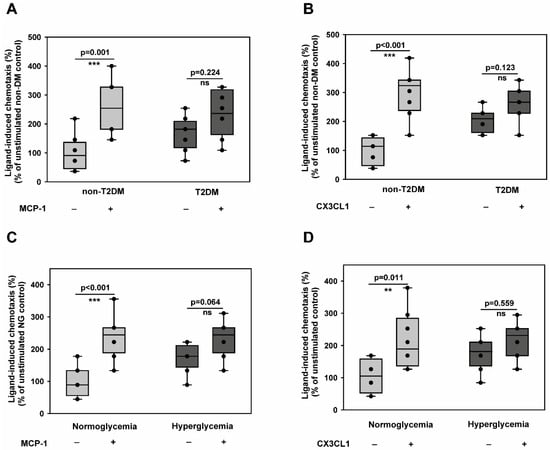 Since it is known that monocyte accumulation promotes atherogenesis and creates a pro-inflammatory state, we wondered whether diabetic conditions accelerate monocyte chemotaxis towards athero-promoting cytokines like CCL2 (MCP-1) and CX3CL1 (fractalkine). This was particularly important to understand given the reported induction of monocyte dysfunction in T2DM [23]. To investigate that, we carried out monocyte static transmigration assays using Boyden chamber assays. As shown in Figure 1A,B, monocytes from T2DM patients were indeed in an activated state, as reflected by their enhanced random motility (chemokinesis). However, we could not detect any acceleration of the chemotactic activity towards MCP-1 (Figure 1A) and CX3CL1 (Figure 1B) by T2DM monocytes. Furthermore, we established an in vitro hyperglycaemic setting that mimics diabetic conditions by exposing monocytes to 25 mM of glucose for 48 h. Under these conditions, neither the survival (Supplementary Figure S1A) nor the expression of the monocyte-specific marker, CD14, was altered (Supplementary Figure S1B).