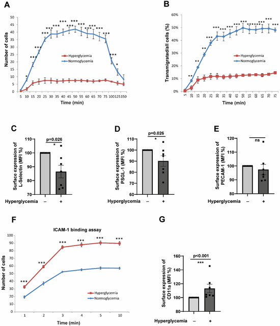 The interaction of primary monocytes and endothelial cells was investigated during live cell imaging under flow conditions for several hours. Tracking the monocytes disclosed several impairments in their functional parameters. We carried out flow assays to understand whether the impaired chemotactic behaviour of monocytes exposed to hyperglycaemic conditions (described in Figure 1C,D) results in an impairment of monocyte transmigration. Under flow, we analysed the ability of hyperglycaemic monocytes to undergo transendothelial migration through human umbilical vein endothelial cells (HUVECs). As shown in Figure 2A, hyperglycaemic conditions significantly impaired the transmigration capacity of monocytes. The difference in the transmigration behaviour was visible from 10 to 125 min. Besides that, we also analysed the number of transmigrated cells. We correlated that to the total number of adherent cells to rule out the differences in adhesion to the observed lower transendothelial migration rates. When all the adherent cells were analysed, the hyperglycaemic adherent monocytes showed almost a 30–40% reduction in the transmigration capacity compared to normoglycemic monocytes (Figure 2B). Therefore, it can be concluded that the alterations in the transendothelial migration exhibited by the hyperglycaemic monocytes seen under flow conditions are due to the phenotypic alterations induced by hyperglycaemia. Since leukocyte-endothelial interaction and transendothelial migration are governed by a plethora of ligand-receptor interactions [25], we looked at the expression levels of selectins, PSGL-1 (P-Selectin glycoprotein ligand-1), L(eukocyte)-Selectin, and PECAM-1 (Platelet–endothelial cell adhesion molecule-1). As shown in Figure 2C,D, our experiments revealed a significantly reduced expression level of L-Selectin and PSGL-1 in hyperglycaemic monocytes. PSGL-1, a dimer expressed on leukocytes, interacts with L-, P(latelet)- and E(ndothelial)-selectins. PSGL1 plays a vital role in rolling arrest and signalling processes [26]. It is tempting to speculate that a lower expression of selectins leads to a decreased capacity of the cells to escape the blood flow and initiate the initial engagement with the endothelial cell receptors, promoting transendothelial migration. PECAM-1, a member of the immunoglobulin superfamily, interacts with VCAM-1 (vascular cell adhesion molecule-1), which is only expressed on the endothelial cell surface and allows an arrest of rolling, is required for a firm adhesion and also for transendothelial migration [27]. However, we did not detect significant changes in the PECAM-1 level in hyperglycaemic monocytes (Figure 2E). Intercellular Adhesion Molecule 1 (ICAM-1) is an essential mediator of the leukocyte adhesion process by binding to the β2 integrin lymphocyte function-associated antigen (LFA)-1 (αLβ2 or CD11a-CD18) on the surface of leukocytes [28]. Therefore, we wondered whether ICAM-1 interactions with LFA-1 are impaired in hyperglycaemic monocytes. ICAM-1 binding assays revealed that hyperglycaemic monocytes can significantly adhere more to ICAM-1 compared to normoglycaemic monocytes (Figure 2F). This could be due to the upregulation of integrins. We, therefore, checked the expression levels of CD11a, CD11b, and CD18. As expected, the higher adhesion ability of hyperglycaemic monocytes was due to elevated expression of CD11a (Figure 2G). However, we could not detect any differences in the expression levels of CD18 or CD11b (Supplementary Figure S2A,B).