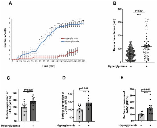 Furthermore, we specifically looked at the time duration at which monocytes remain in the ablumen. Hyperglycaemic monocytes spend significantly more time in the ablumen than their normoglycemic counterparts (Figure 3B). Reverse transmigration of monocytes is known to be controlled by the interactions of Junctional Adhesion Molecule 3 (JAM-3), by acting as a counterreceptor for the integrin MAC-1 (αMβ2; CD11b-CD18). JAM-3 has been validated as a cognate counterreceptor for MAC-1 [29]. Supplementary Figure S2A,B showed that both CD18 and CD11b expression were not altered in hyperglycaemic monocytes. As an alternate approach, we analysed the activation status of CD11b and LFA-1 integrins. Interestingly, both LFA-1 and CD11b were heavily activated in hyperglycaemic monocytes (Figure 3C,D). We also analysed the expression of JAM-3 in the endothelial cells subjected to hyperglycaemic conditions. The results revealed a statistically significant upregulation of JAM-3 (Figure 3E). These results suggested that the upregulated JAM-3 on the surface of endothelium could interact with activated CD11b on monocytes, leading to the entrapment of monocytes in the ablumen under hyperglycaemic conditions.