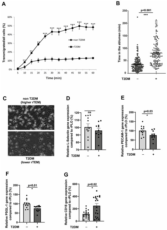 Inflammatory CD14+CD16− monocytes from T2DM patients recapitulate the impaired TEM and rTEM phenotype. (A) CD14+CD16− monocytes from non-T2DM individuals (n = 3) or T2DM patients (n = 6) were flowed over activated HUVECs for 5 min. Monocytes were individually tracked, and their positions were marked at regular intervals (5–60 min). (B) Same as in (A), but the analysis was performed in such a way that the time spent by each cell in the ablumen was calculated. Non-T2DM, n = 166; T2DM, n = 160. (C) Representative images from the experiment (A). (D–F) CD14+CD16− monocytes from non-T2DM individuals (n = 11) or T2DM patients (n = 11) were analysed for the expression of L-selectin, PECAM-1, and PSGL-1 using RT-qPCR. All data are means ± SEM. (G) CD14+CD16− monocytes from non-T2DM individuals (n = 22) or T2DM patients (n = 21) were analysed for the expression of L-selectin, PECAM-1, and PSGL-1 using RT-qPCR. All data are means ± SEM. * p < 0.05, ** p < 0.01, and *** p < 0.001.