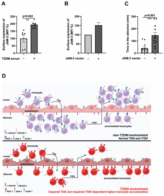 JAM-3 is the primary regulator of impaired rTEM phenotype (A). HCAECs (Human Coronary Artery Endothelial Cells) were seeded until 80% confluence and then exposed to a 1:5 serum: cell culture medium mix for 48 h. The serum was obtained from either non-T2DM individuals or T2DM patients after incubation with HCAECs, and analysed by flow cytometry for the surface expression of JAM-3. The mean fluorescence intensity (MFI) was then quantified. n = 6. All data are means ± SEM. (B) HCAECs were electroporated with either JAM-3 overexpression plasmid or control plasmid, and after 24 h, the expression levels of JAM-3 were analysed using flow cytometry. (C) HCAECs were electroporated with either JAM-3 overexpression plasmid or control plasmid. After 24 h, CD14+CD16− monocytes obtained from healthy donors were flowed over JAM-3 overexpressing or control HCAECs for 5 min. Monocytes were then individually tracked, and their positions were marked at regular intervals (5–250 min). The time spent by each cell in the ablumen was then calculated. All data are means ± SEM. ** p < 0.01, and *** p < 0.001. (D) The working model depicts the mechanisms that mediate impaired TEM and rTEM of monocytes, resulting in a higher accumulation of monocytes in the ablumen. Reduced L-selectin and PECAM-1 potentially mediate impaired TEM, and the upregulation of activated MAC-1-dependent engagement of JAM-3 in endothelial cells traps monocytes in the ablumen, preventing these cells from reverse transmigrating. Accumulated monocytes will result in higher inflammation induction and promote the atherogenesis process.