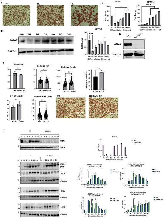 (A) Oil Red O staining of 3T3-L1 cells at the end of differentiation (10×, 20×, and 40× magnification). (B) Expression levels of GATA-3 and PPARγ mRNA at various differentiation time points for 3T3-L1 cells. (C) Expression levels of GATA-3 protein in 3T3-L1 cells at different differentiation time points. Levels were measured by Western blotting. (D) GATA-3 knockout validation at the protein level (Western blotting). (E) Comparison of the differentiation capacity between GATA-3 knockout (KO) 3T3L-1 cells and non-targeting (NT) control cells. Cells were fixed and stained with Oil Red O on day 10 (final differentiation). Three images were captured per treatment, and four fields per image were quantified using Image J (USA). (F) Expression levels of PPARγ, CEBPα, CEBPβ, and PGC-1α by Western blotting and RT-PCR at various differentiation time points in NT and GATA-3 KO cells. The expression levels were normalized to GAPDH and compared to NT D0 for RT-PCR to calculate the fold changes presented. Levels were measured by Western blotting in three independent experiments, normalized to α-TUBULIN, and compared to NT D0 to calculate fold changes. The fold changes for each time point were analyzed using ordinary one-way ANOVA on GraphPad Prism. * = p < 0.05 (n = 3). ns: non-significant. * p < 0.05, ** p < 0.01, *** p < 0.001, **** p< 0.0001.