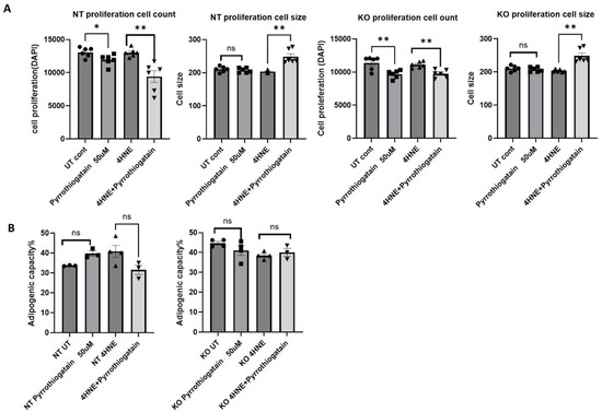 (A) The effect of Pyrrothiogatain on cell proliferation and size following 4-day treatment period. (B) Adipogenic capacity (%) following treatment with Pyrrothiogatain and 4-HNE in non-targeting (NT) and GATA-3 knockout (KO) cells, including untreated (UT) controls. Data are presented as mean ± SEM, with statistical differences determined using a t-test (n = 4). ns: non-significant. * p < 0.05, ** p < 0.01.