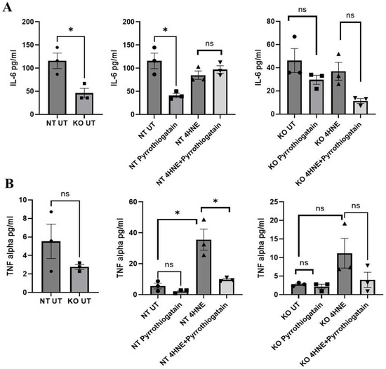 Secreted cytokine levels of IL-6 (A) and TNF-alpha (B) at baseline and after treatment with Pyrrothiogatain and 4-HNE in non-targeting (NT) and GATA-3 knockout (KO) cells, including untreated (UT) samples. Data presented as mean ± SEM, and the difference was calculated using t-test (n = 3). ns: non-significant. * p < 0.05.