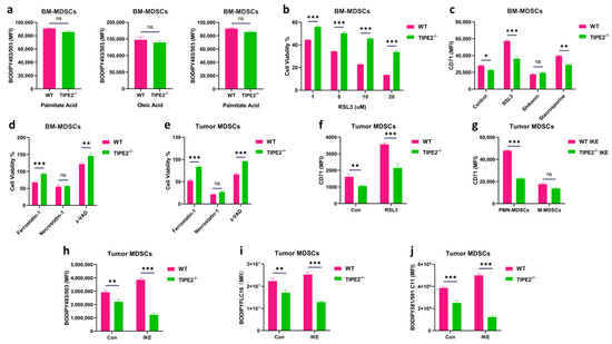 TIPE2, a phospholipid transfer protein, can influence cellular lipid composition by moving the phospholipid between the cell membrane and cytoplasm [52]. Lipid peroxidation is typically characterized by the accumulation of PE and PC species containing C18:0/C20:4, C18:0/C22:4, and C18:0/C22:6 in cells [14]. To test whether TIPE2 changes lipid peroxidation-related PE and PC species in MDSCs, we measured these PUFA-PLs and PUFA-ePLs in tumor MDSCs of Wild-type (WT) and TIPE2-deficient (TIPE2−/−) C57BL/6 mice bearing LLC (Lewis lung carcinoma) treated with IKE (the ferroptosis inducer widely used for in vivo research) by targeted phospholipid analysis using the HPLC-MS/MS system. This analysis showed that the content of either PE (plasm-18:0/20:4), PE (plasm-18:0/22:4), or PE (18:0/22:6), but not PE (18:0/20:4) and PE (18:0/22:4), was lower in TIPE2−/− tumor MDSCs than in WT tumor MDSCs (where plasm indicates plasmalogens or PUFA-ePLs). Among the choline-containing phospholipids, the content of either PC (18:0/20:4), PC (18:0/22:4), or PC (18:0/22:6) was also reduced in TIPE2−/− tumor MDSCs than in WT tumor MDSCs (Table 1). PUFA-PLs and PUFA-ePLs are formed through the uptake and accumulation of exogenous fatty acids in cells. To identify whether TIPE2 regulates fatty acid accumulation in MDSCs, we detected the lipid level in Gr-1+ bone marrow-derived MDSCs (BM-MDSCs) treated with different fatty acids in the in vitro culture. We found that TIPE2−/− MDSCs markedly inhibited polyunsaturated fatty acid (linoleic acid) accumulation but did not affect the level of saturated fatty acids (palmitate acid) and monounsaturated fatty acids (oleic acid) compared to WT MDSCs (Figure 1a and Figure S1a).
