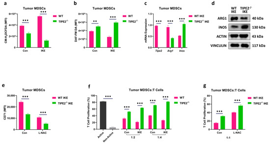 Previous work has indicated that ferroptosis renders MDSCs more immunosuppressive [46]. To investigate whether TIPE2 confers ferroptosis-induced immunosuppressive function in MDSCs, we checked the key immunosuppressive mediators of MDSCs. Due to decreased lipid peroxidation-related phospholipid accumulation, IKE-treated TIPE2−/− tumor MDSCs unquestionably reduced the ROS production when compared to IKE-treated WT tumor MDSCs (Figure 3a and Figure S3a). Surprisingly, IKE-treated TIPE2−/− tumor MDSCs substantially increased the nitric oxide (NO) level compared to IKE-treated WT tumor MDSCs (Figure 3b and Figure S3a). Through RT-qPCR and western blotting detection, we observed that IKE-treated TIPE2−/− tumor MDSCs evidently decreased the M2 immunosuppressive signature gene (Arg1) and marker protein (ARG1), whereas they markedly increased the M1 immune stimulatory signature gene (Inos) and protein (iNOS) when compared to IKE-treated WT tumor MDSCs (Figure 3c,d and Figure S3d). Furthermore, treatment with the ROS inhibitor N-acetyl cysteine (L-NAC) led to a more significant reduction in CD71 expression in IKE-treated TIPE2−/− tumor MDSCs compared to IKE-treated WT tumor MDSCs (Figure 3e and Figure S3b). Indeed, when tested in vitro, IKE-treated TIPE2−/− tumor MDSCs had a reduced capacity to block T cell proliferation in a ratio-dependent manner, compared with those from IKE-treated WT controls (Figure 3f and Figure S3c). Importantly, IKE-treated TIPE2−/− tumor MDSCs pretreated with L-NAC further reduced their ability to block T cell proliferation, compared with those from IKE-treated WT controls (Figure 3g and Figure S3c). The above results suggest that TIPE2 conferred the ferroptosis-induced immunosuppressive function of MDSCs in a lipid ROS-dependent manner.