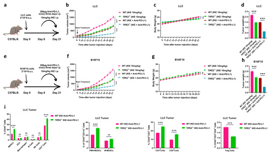 Considering that ICB therapy mainly contributes to restoring the killing function of CTLs against tumor cells in tumor tissues [1], and TIPE2 deletion in MDSCs can re-sensitize tumors to ferroptosis therapy (Figure 4), we wanted to examine whether TIPE2-deficient MDSCs combined with ferroptosis induction and ICB therapy could represent a therapeutic option for tumor treatment. WT and TIPE2−/− mice bearing s.c. LLC or B16F10 tumors were administrated with IKE (one injection every day), or anti-PD-L1 antibody (one injection every three days), or a combination of IKE and anti-PD-L1 antibody for two weeks starting from day 8 post-tumor inoculation (Figure 5a,e). While the dual administration of IKE and anti-PD-L1 antibody inhibited LLC or B16F10 tumor growth compared to a single administration of IKE in WT mice, the combination of these two showed even more effectiveness in delaying LLC or B16F10 tumor progression in TIPE2−/− mice when compared with the dual treatment in WT mice (Figure 5b,f). The combination therapeutic effect was irrelevant to body weight (Figure 5c,g), but was directly correlated with tumor weight and mass (Figure 5d,h and Figure S5d,e); that is to say, the better the combination therapeutic effect, the lower tumor weight and mass.