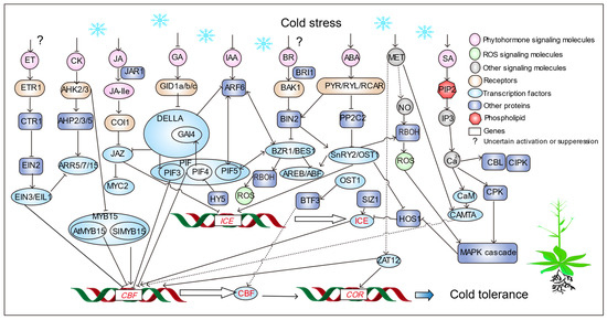 The mechanism of cold stress tolerance in plants. Arrows and lines ending in bars indicate activation and suppression processes, respectively. Solid lines represent direct interactions and dotted lines indicate indirect interactions. See the text for additional details. Abbreviations: ET, ethylene; CK, cytokinins; JA, jasmonate; GA, gibberellins; IAA, indole acetic acid; BRs, brassinosteroids; ABA, abscisic acid; SA, salicylic acid; MET, melatonin; ETR1, ethylene response 1; CTR1, constitutive triple response 1; EIN, ethylene-insensitive; AHK, A. thaliana histidine kinase; AHP, histidine phosphotransfer protein; ARR, A. thaliana. response regulator; JAR1, jasmonate resistant 1; COI1, coronatine insensitive 1; JAZ, jasmonate ZIM-domain protein; MYC2, myelocytomatosis proteins 2; PIF, phytochrome-interacting factor; GID, gibberellin-insensitive dwarf 1; GAI, gibberellic acid insensitive; ARF, auxin response factor; BRI1, brassinazole-resistant 1; BAK1, BRI1-associated receptor kinase 1; BIN, brassinosteroid-insensitive; BZR1, brassinazole-resistant 1; AREB/ABF, ABA-responsive element binding protein/ABRE-binding factor; PYR/RYL/RCAR, pyrabactin resistance 1/PYR-like/regulatory components of ABA receptors; PP2C2, protein phosphatase 2C; OST1, open stomata 1; PIP2, phosphatidylinositol 4,5-bisphosphate; IP3, inositol trisphosphate; CaM, calmodulin; CAMTA, calmodulin-binding transcription activator; CBL, calcineurin B-like protein; CIPK, calcineurin B-like protein; CPK, calcium-dependent protein kinases; MYB, v-myb avian myeloblastosis viral; MAPK, mitogen-activated protein kinases; SIZ1, small ubiquitin-like modifier E3 ubiquitin ligase; HOS1, high expression of osmotically responsive gene 1; BTF3, basic transcription factor 3; NO, nitric oxide; HY5, elongated hypocotyl 5; DELLA, DELLA protein; RBOH, respiratory burst oxidase homologue; ROS, reactive oxygen species; ZAT12, Zinc finger of Arabidopsis thaliana 12; ICE, inducer of CBF expression; CBF, C-repeat binding factor; COR, cold regulated gene.