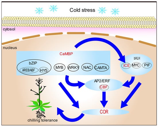 A model to explain transcription factors of cold tolerance in plants. By regulating a large number of transcription factors, the mechanisms of triggering a series of responses to plant cold tolerance can be redesigned. Abbreviations: CaMBP, CaM-binding proteins; bZIP, basic leucine zipper; AREB/ABF, ABA-responsive element binding protein/ABRE-binding factor; HY5, hypocotyl 5; MYB, v-myb avian myeloblastosis viral; WRKY, WRKY transcription factors; NAC, NAC transcription factors; CAMTA, calmodulin-binding transcription activator; AP2/ERF, aptala2/ethylene response factor; bHLH, basic helix–Loop–helix; MYC, myelocytomatosis proteins; PIF, phytochrome-interacting factor; ICE, an inducer of CBF expression; CBF, C-repeat binding factor; COR, cold regulated gene.