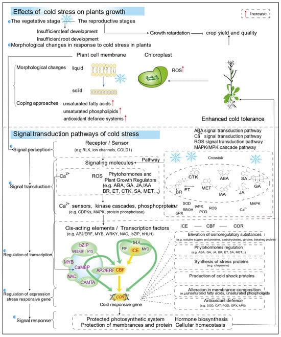Crop yields are negatively affected by cold stress, including chilling (0~12 °C) and freezing stress (≤0 °C) resulting in constrained sowing time, damage to plant tissues, and stunted plant growth [1]. Tolerance to cold stress in plants can be divided into chill-susceptible (<12 °C plants will be damaged), chill-tolerant but freezing susceptible (0~12 °C plants can adapt, but once the tissues are frozen, the cells will be damaged), and freeze-tolerant (survival < 0 °C) [2]. Cold stress seriously threatens global crop productivity and yield reduction in temperate climates [3]. The influence of cold stress depends on the status of plant cellular morphology (e.g., membranes and organelles) [4], biochemistry (e.g., enzyme activity) [5], physiological functioning (e.g., gas exchange and water management) [6], and phenology (e.g., developmental stages) [7]. The physio-biochemical adaptive mechanisms of plants have been widely discussed, but less attention has been paid to molecular adaptive mechanisms. Thus, plant responses to cold stress are complex and multidimensional, involving signal perception and transduction.