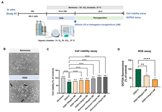 The neuroprotective effects of the AM extract were evaluated under oxygen-glucose deprivation (OGD) conditions, an in vitro model established for mimicking ischemic stroke [18]. NS-1 cells, developed for drug screening, were exposed to OGD stress [15]. After 10 or 24 h of OGD, cells were reoxygenated for 24 h (Figure 1A). OGD induced inflammation and cell death due to the increasing reactive oxygen species (ROS) production [19,20]. Following OGD, morphological changes were observed, including elongated neurites, distorted cell bodies, and a higher proportion of dead cells (Figure 1B).