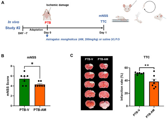 To analyze the beneficial effects of AM, 14 mice were divided into two groups at random: a control group (PTB-V, n = 7) and an AM treatment group (PTB-AM, n = 7) for mNSS scoring and TTC staining. Mice designated as the control group received saline, and the treatment group were administered 200 mg/kg AM extract orally using metallic oral gavage needles attached to a 1 mL syringe.