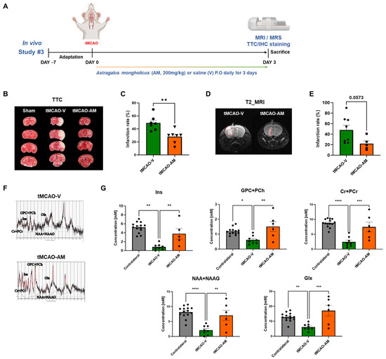 AM administration lowered cerebral I/R injury and increased the level of metabolites in tMCAO mouse brain. (A) Experimental schematic. (B) TTC staining and (C) quantification of infarct ratio between tMCAO-V and tMCAO-AM groups (tMCAO-V, n = 7, tMCAO-AM, n = 7). (D) Representative images of the penumbra region (red dotted lines) in tMCAO-V and tMCAO-AM groups, and (E) quantification of penumbra area in MRI T2 imaging (tMCAO-V, n = 8, tMCAO-AM, n = 5). (F) Magnetic resonance spectroscopy (MRS) signal intensities in tMCAO-V and tMCAO-AM groups. (G) The analysis of the levels of metabolites comparing tMCAO-V and tMCAO-AM groups (Ins, Contralateral. n = 14; tMCAO-V, n = 8; tMCAO-AM, n = 5; GPc+PCh, Contralateral. n = 13–14; tMCAO-V, n = 8; tMCAO-AM, n = 6; Cr+PCr, Contralateral. n = 14; tMCAO-V, n = 8; tMCAO-AM, n = 6; NAA+NAAG, Contralateral. n = 14; tMCAO-V, n = 8; tMCAO-AM, n = 6; Glx, Contralateral. n = 14; tMCAO-V, n = 8; tMCAO-AM, n = 6). Data are shown above as mean ± SEM. Statistical significance was assessed using an unpaired t-test for TTC staining and infarct ratio and a one-way ANOVA followed by Tukey’s multiple comparison test for MRS. Significance thresholds: * p < 0.05, ** p < 0.01, *** p < 0.001, and **** p < 0.0001.
