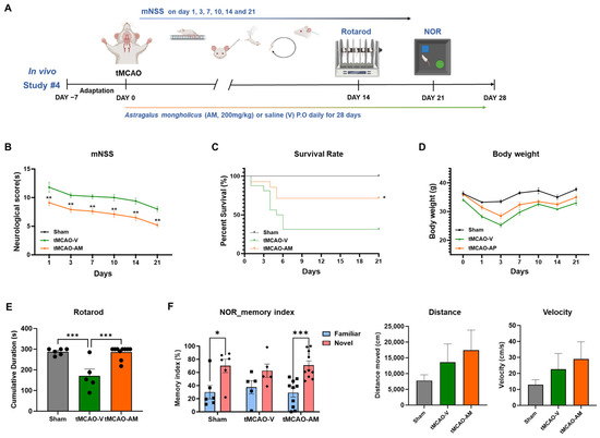 After 21 days, the survival rate was notably higher in the tMCAO-AM group (71.43%) compared to the tMCAO-V group (31.25%) (Figure 5C). Body weight, monitored over 3 weeks, showed a temporary postoperative decrease that gradually normalized in all groups (Figure 5D). Motor function was tested on day 14 with the rotarod test, where the tMCAO-AM group demonstrated significantly longer latency (285.40 ± 9.21, *** p < 0.001) compared to the tMCAO-V group (171.10 ± 32.64), with no significant difference between the tMCAO-AM and sham groups (287.8 ± 6.3) (Figure 5E).