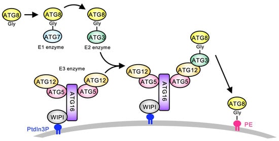 - Mizushima, N. The ATG conjugation systems in autophagy. Curr. Opin. Cell Biol. 2020, 63, 1–10. [Google Scholar] [CrossRef] [PubMed]