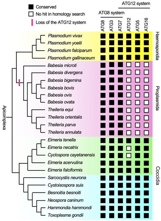Since the ATG8 and ATG12 conjugation systems are essential for autophagy in model organisms, the ATGs involving these systems are thought to be universally conserved across eukaryotes. However, previous studies have revealed the loss of ATG10, the E2-like enzyme in the ATG12 conjugation system, in several eukaryotic lineages, highlighting the diversity within the ATG12 system [5,6,7]. In this study, we present two key findings: our homology search did not detect any genes of the ATG12 system in piroplasmida, a subgroup of Apicomplexa, and the piroplasm ATG3 does not possess AIM12 associated with the interaction of ATG12. Together, these findings strongly support the evolutionary loss of the ATG12 system in the common ancestor of the piroplasm lineage.