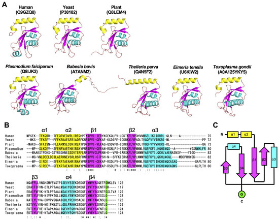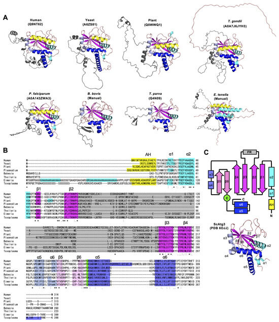 Structural conservation of ATG8 homologs in Apicomplexa. (A) Three-dimensional structures of full-length ATG8 homologs among model organisms and apicomplexans predicted by AlphaFold. The UniProt numbers that can be used for searching in the AlphaFold Protein Structure Database (https://alphafold.ebi.ac.uk/, accessed on 10 January 2025) are shown. (B) Amino acid alignment of ATG8 homologs among model organisms and apicomplexans. Plasmodium: Plasmodium falciparum, Babesia: Babesia bovis, Theileria: Theileria parva, Eimeria: Eimeria tenella. The color corresponds with (A). (C) A schematic diagram of 3D structures conserved in ATG8. The color of each box corresponds with (A). (A–C) Yellow: ATG8-specific N-terminal α helix, cyan: α helix, magenta: β sheet. Human: H. sapiens, yeast: S. cerevisiae, plant: A. thaliana. “*” indicates identical residues across all sequences “:” denotes residues with high chemical similarity and ≥70% similarity “.” represents residues with moderate similarity and 50–70% similarity.