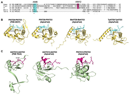 Next, we investigated whether AIM12 is conserved in piroplasmida. While AIM12 has not been identified in Apicomplexa, the Asp-Met sequence is conserved as AIM12 in humans and plants [17,25]. To evaluate the predictability of AIM12 using AlphaFold, we examined the ATG12–ATG3 interaction in the plant Arabidopsis thaliana. The sequences and position of predicted AIM12 matched those previously reported [17] (Figure 5C), with the pLDDT value exceeding 70 (Figure S4B). This demonstrates the utility of AlphaFold in predicting AIM12. We then predicted the PfATG12-PfATG3 complex structure and found that PfATG3 also contained an AIM12-like motif at a position analogous to that in humans and plants (Figure 5A,C), with the pLDDT value exceeding 70 (Figure S4B). The predicted AIM12 in PfATG3 featured an isoleucine residue binding to the hydrophobic pocket of PfATG12, replacing the methionine residue found in humans and plants. This substitution is likely functional, as both residues possess hydrophobic side chains, facilitating interaction with the hydrophobic pocket of ATG12. Importantly, no sequence corresponding to AIM12 was found in piroplasm ATG3 (Figure 5A). This finding strongly suggests that piroplasm ATG3 lacks AIM12, correlating with the absence of ATG12 system genes in them.