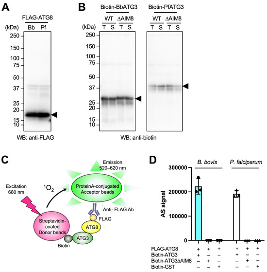 BbATG3 binds to BbATG8 depending on the AIM8. Preparation of FLAG-ATG8 (A) and biotin-ATG3 (B) recombinant proteins by wheat germ cell-free system and confirmation of synthesis by western blotting (arrowhead). For ATG3 (B), the total translation reaction solution (T) and the supernatant after centrifugation (S) were used to confirm the solubility of the mutants. (C) Schematic of the binding detection of FLAG-ATG8 and biotin-ATG3 by AlphaScreen. The method uses two types of dedicated detection beads, a donor and an acceptor bead. A 680 nm light excites the donor bead, which generates singlet oxygen, which is received by the acceptor bead, generating 520–620 nm fluorescence. Since the fluorescence intensity depends on the distance between these two types of beads, the interaction between the two target molecules can be evaluated. The donor bead is coated with streptavidin, which recognizes biotin-ATG3. The other acceptor bead is conjugated with ProteinA, which recognizes the anti-FLAG antibody, and the acceptor bead binds FLAG-ATG8 via the anti-FLAG antibody. (D) Results of binding tests with AlphaScreen for FLAG-ATG8 and biotin-ATG3 in Babesia bovis and Plasmodium falciparum. The vertical axis shows the AlphaScreen signal value (AS signal) and the horizontal axis shows the combination of the proteins. Biotin-GST was used as a negative control for Biotin-ATG3. Experiments were performed in triplicate at three independent times, and the mean of the triplicate for each experiment is indicated by dots. Error bars indicate SD.