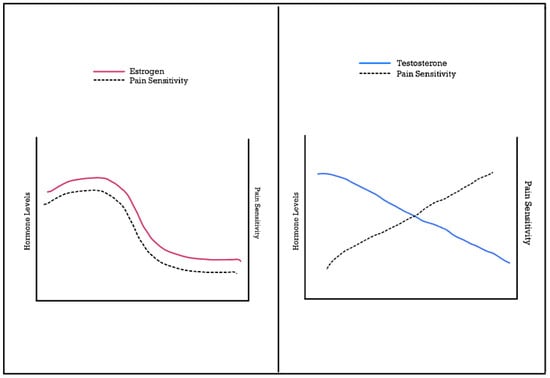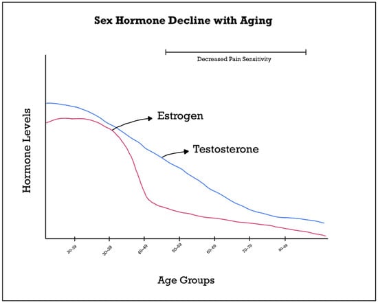 Aging significantly impacts pain perception in females, influenced by complex interactions between hormonal changes, neurobiological mechanisms, and psychosocial factors. Estrogen, a key hormone in females, plays a critical role in pain modulation. Premenopausal women during their reproductive ages tend to experience more pain compared to women, and the main reason for this response is the abrupt fluctuations in hormones throughout their menstrual cycle. For instance, the abrupt drop in estrogen mid cycle which is often followed by ovulation leads to the highest period of pain sensitivity in women [9]. As women age and transition into menopause, declining estrogen levels contribute to altered pain sensitivity. Studies indicate that premenopausal women generally experience enhanced pain sensitivity compared to men, potentially due to estrogen’s influence on pain pathways. The relationship between sex hormones and pain sensitivity is shown in Figure 1. This heightened sensitivity may decrease post-menopause, although older women still report a higher prevalence of chronic pain conditions compared to their male counterparts [7,9].