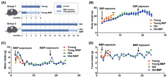 3.1. Age-Dependent Effects of BBP on Body Weight, Water, and Food Intake